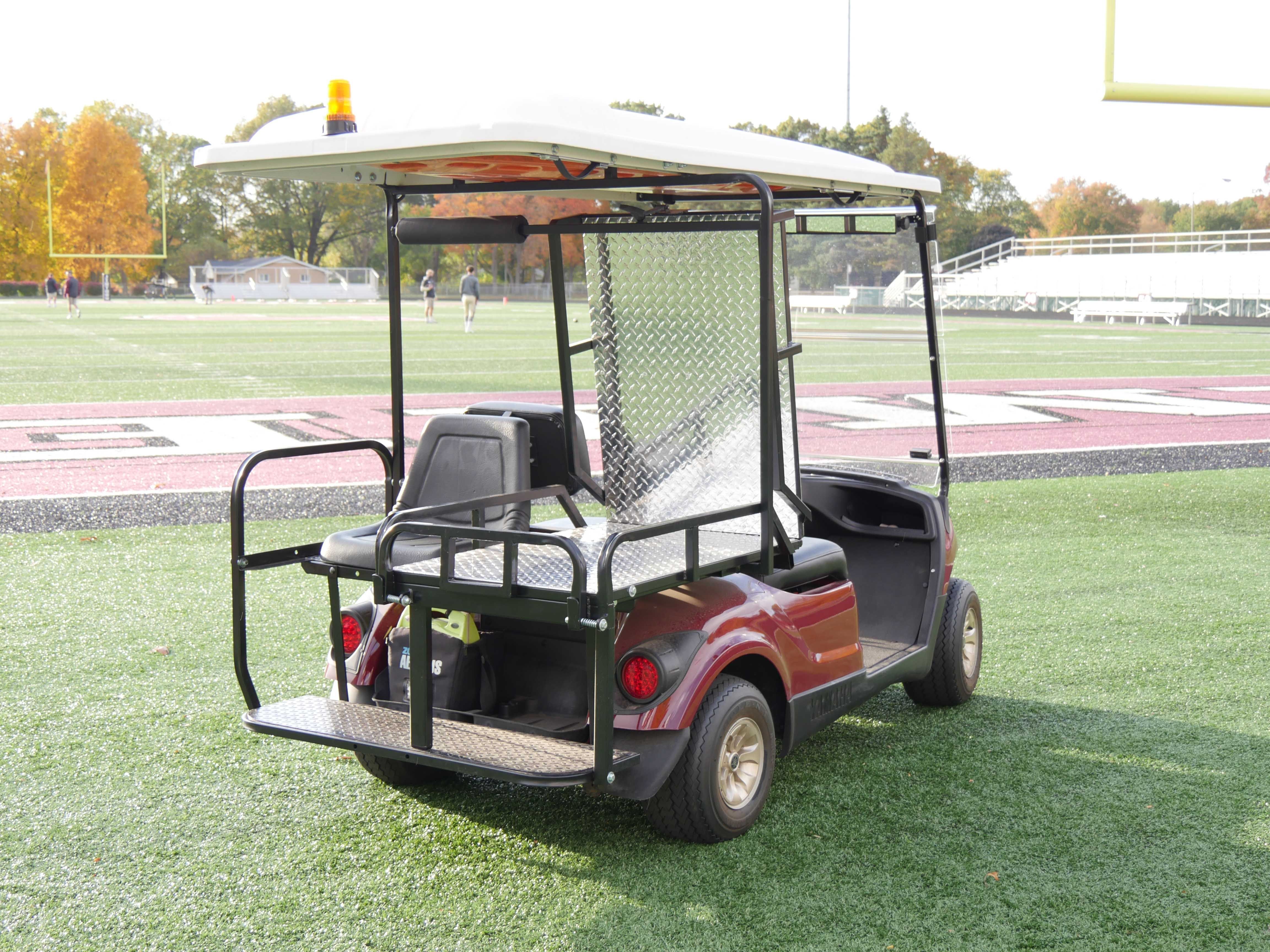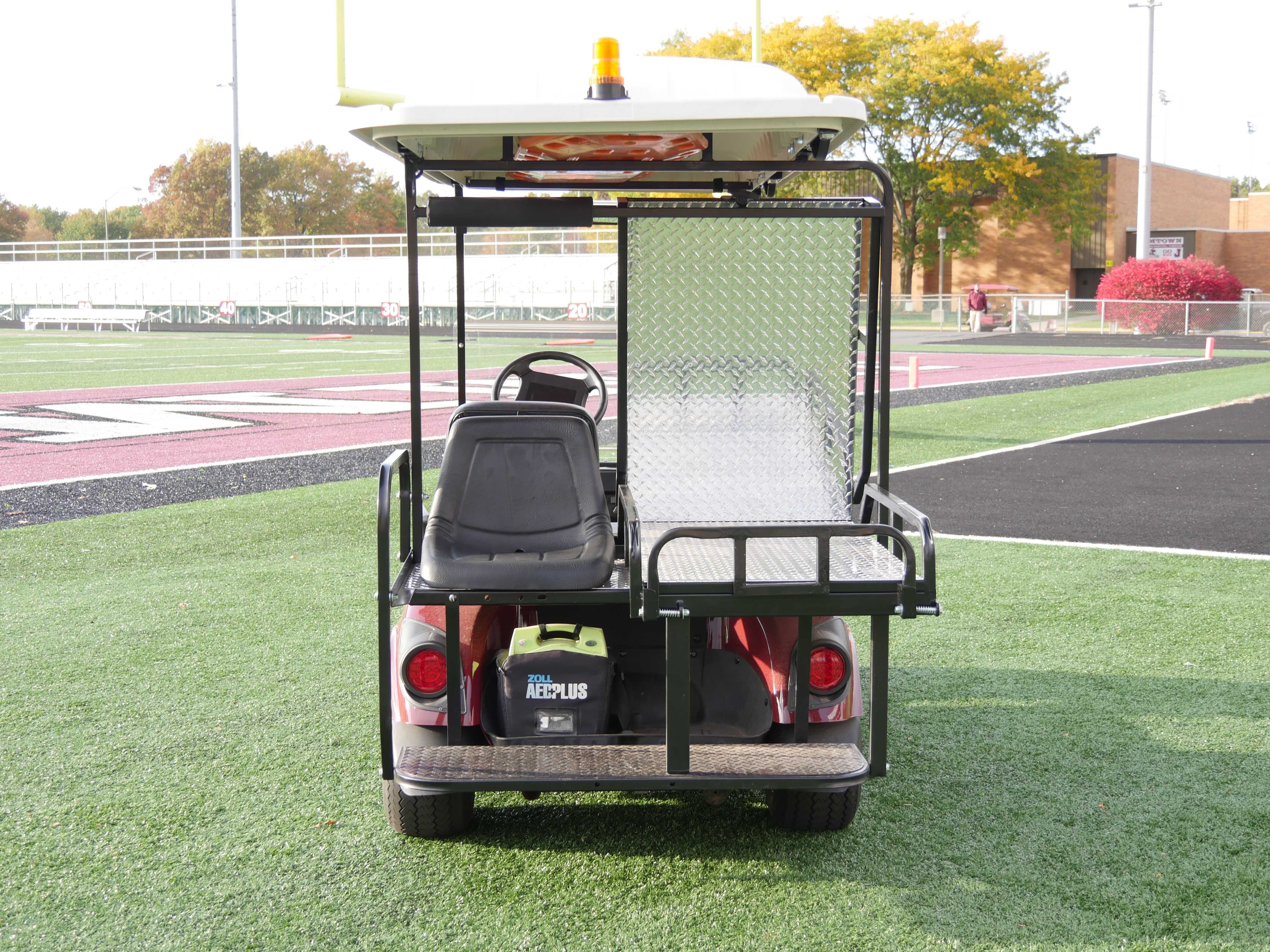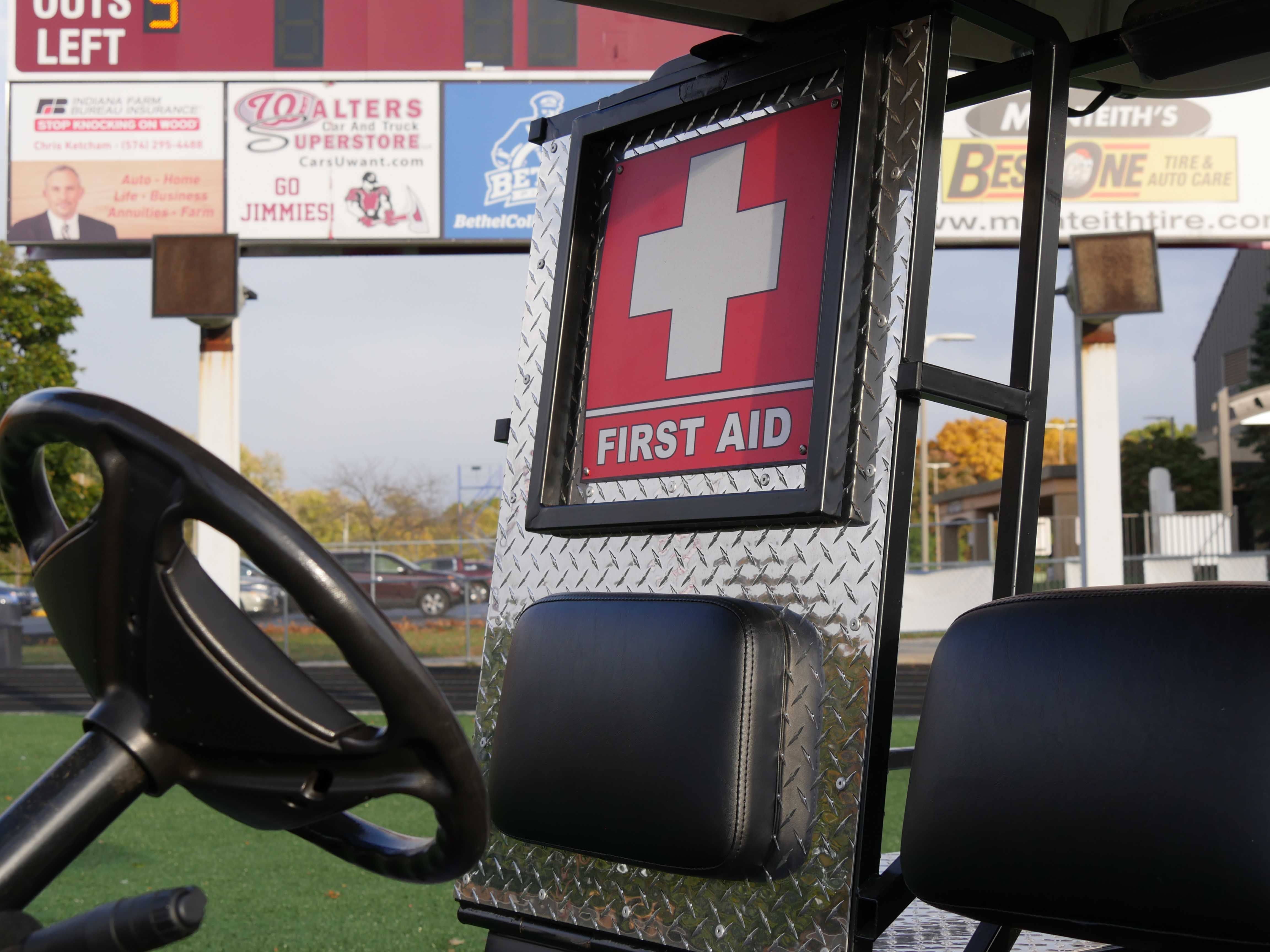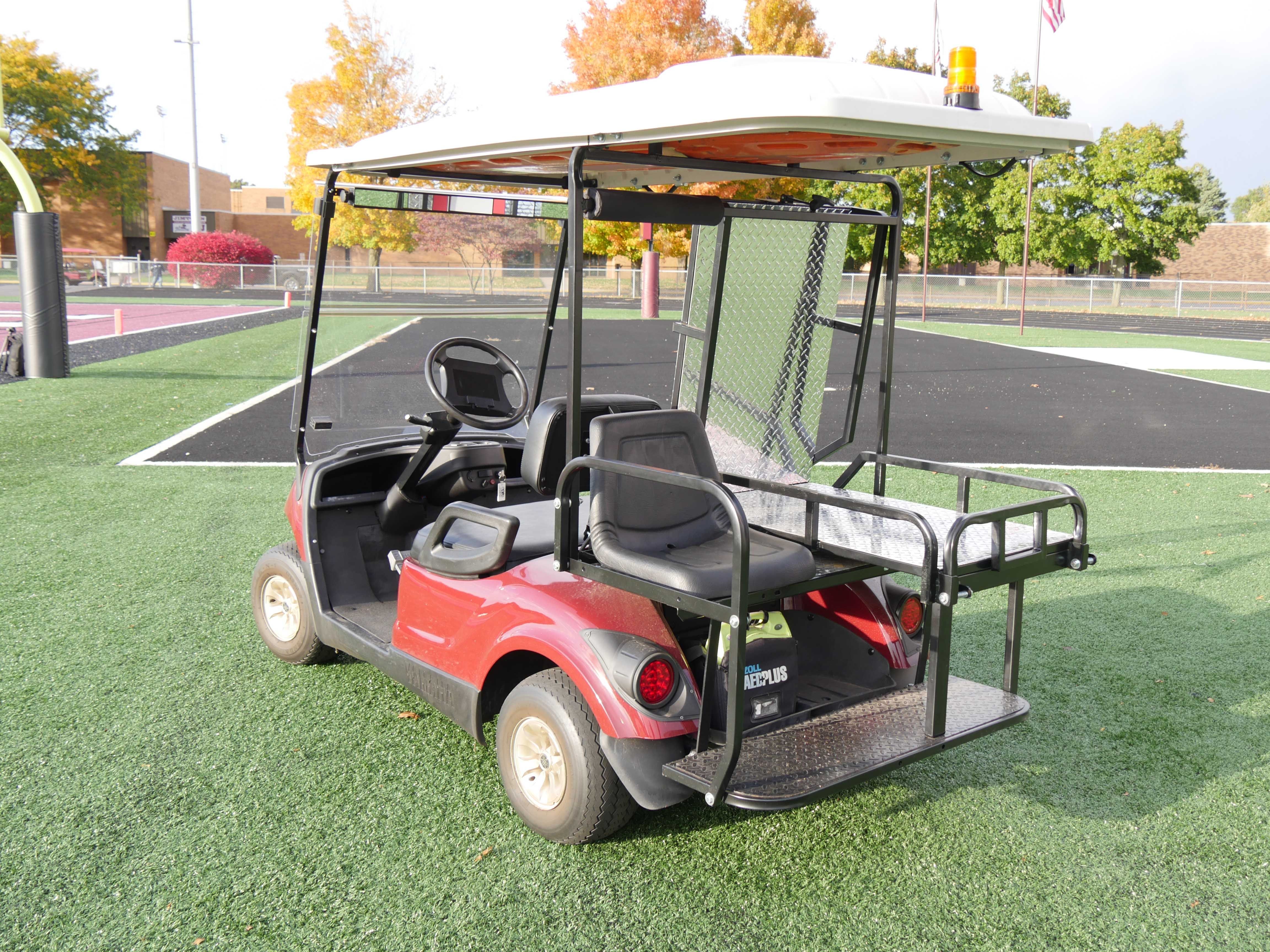 Located under the roof of the emergency cart is a back stretcher, crutches and additional medical supplies and straps. On the rear of the cart there is a platform to haul water and additional supplies while not using the medical cart for injuries or additional personnel. The cart has a full width rear view mirror to keep a safe eye on passengers while driving cautiously to medical attention destination. Extra padded seats have been installed for daily comfort and use.
