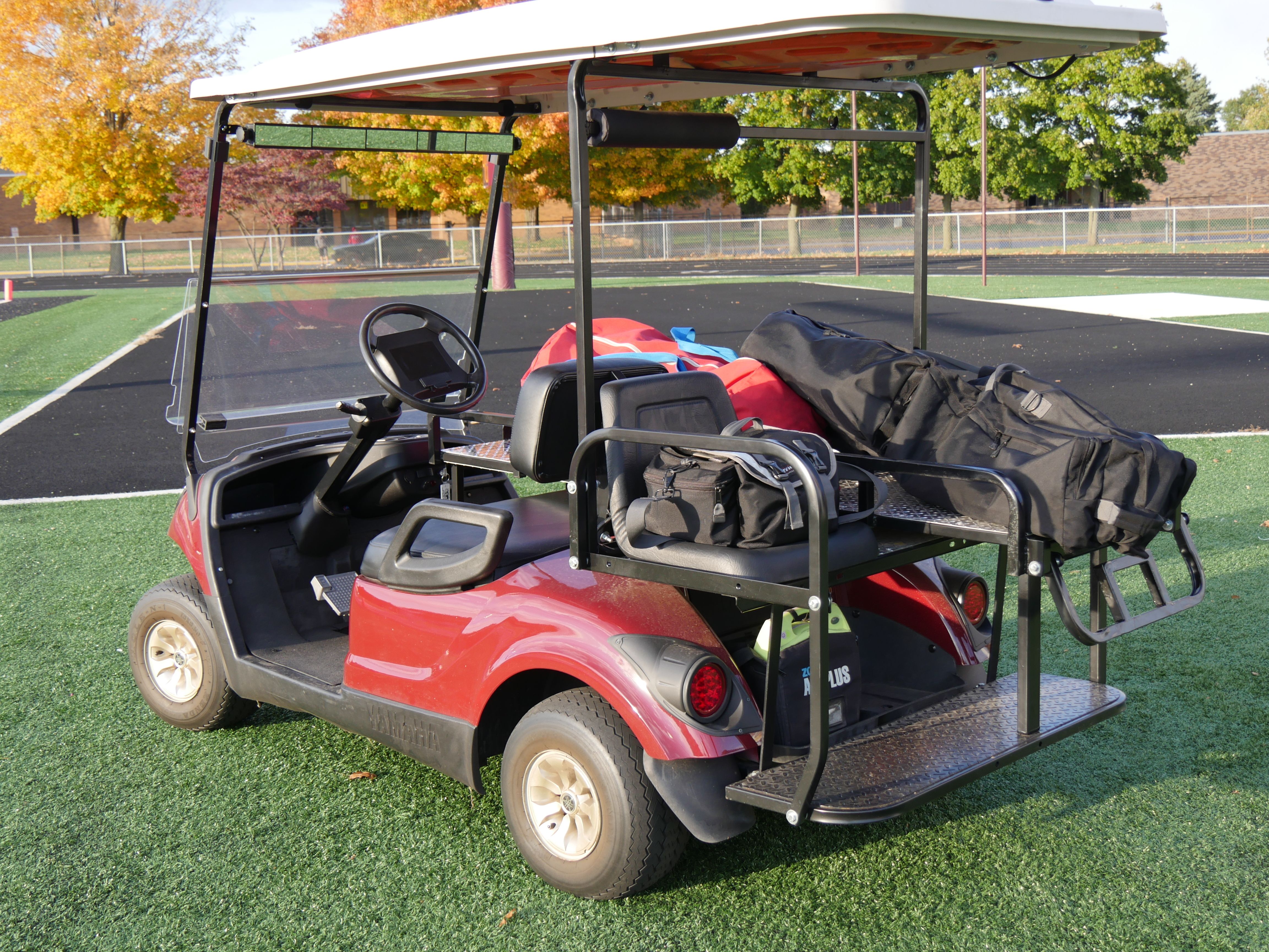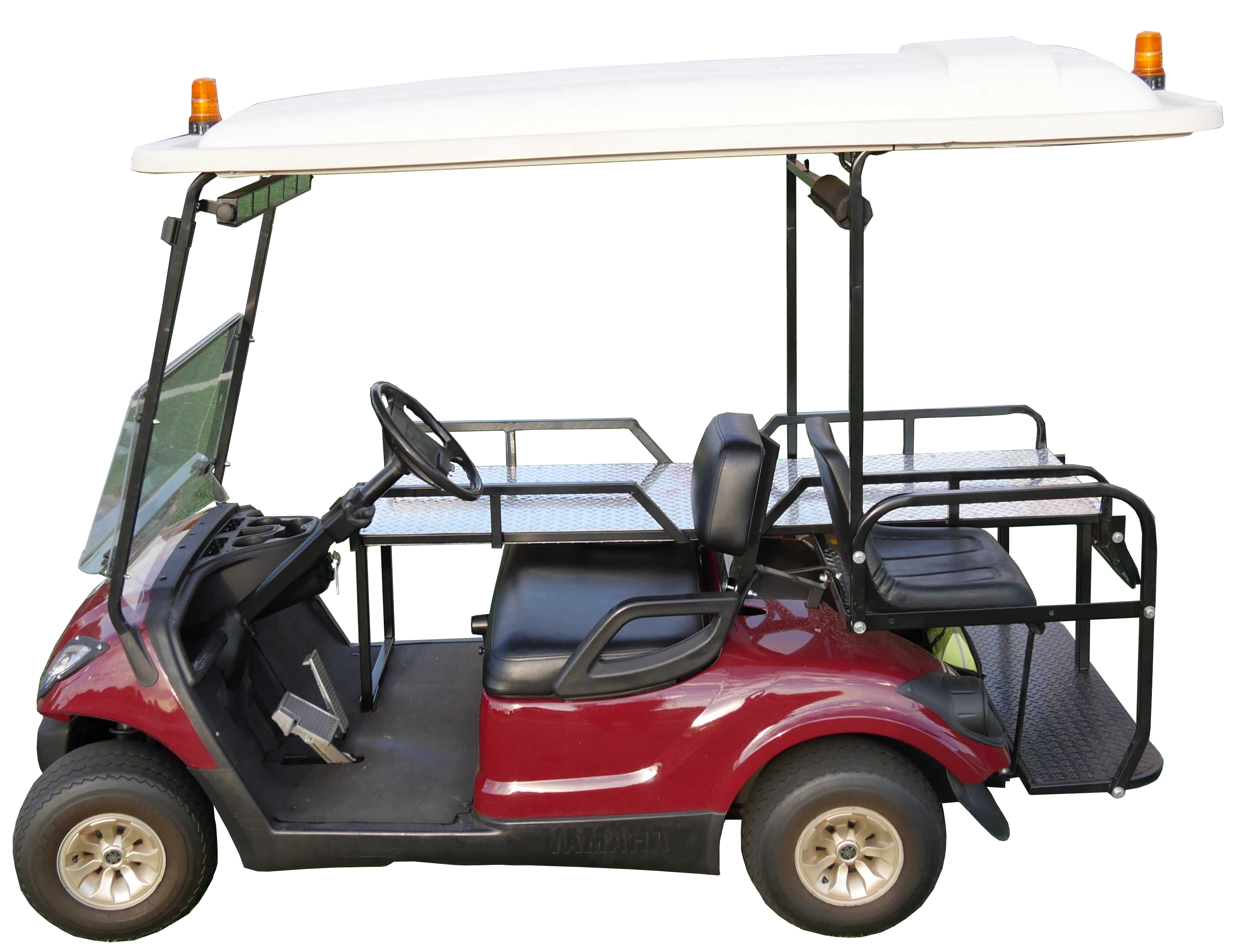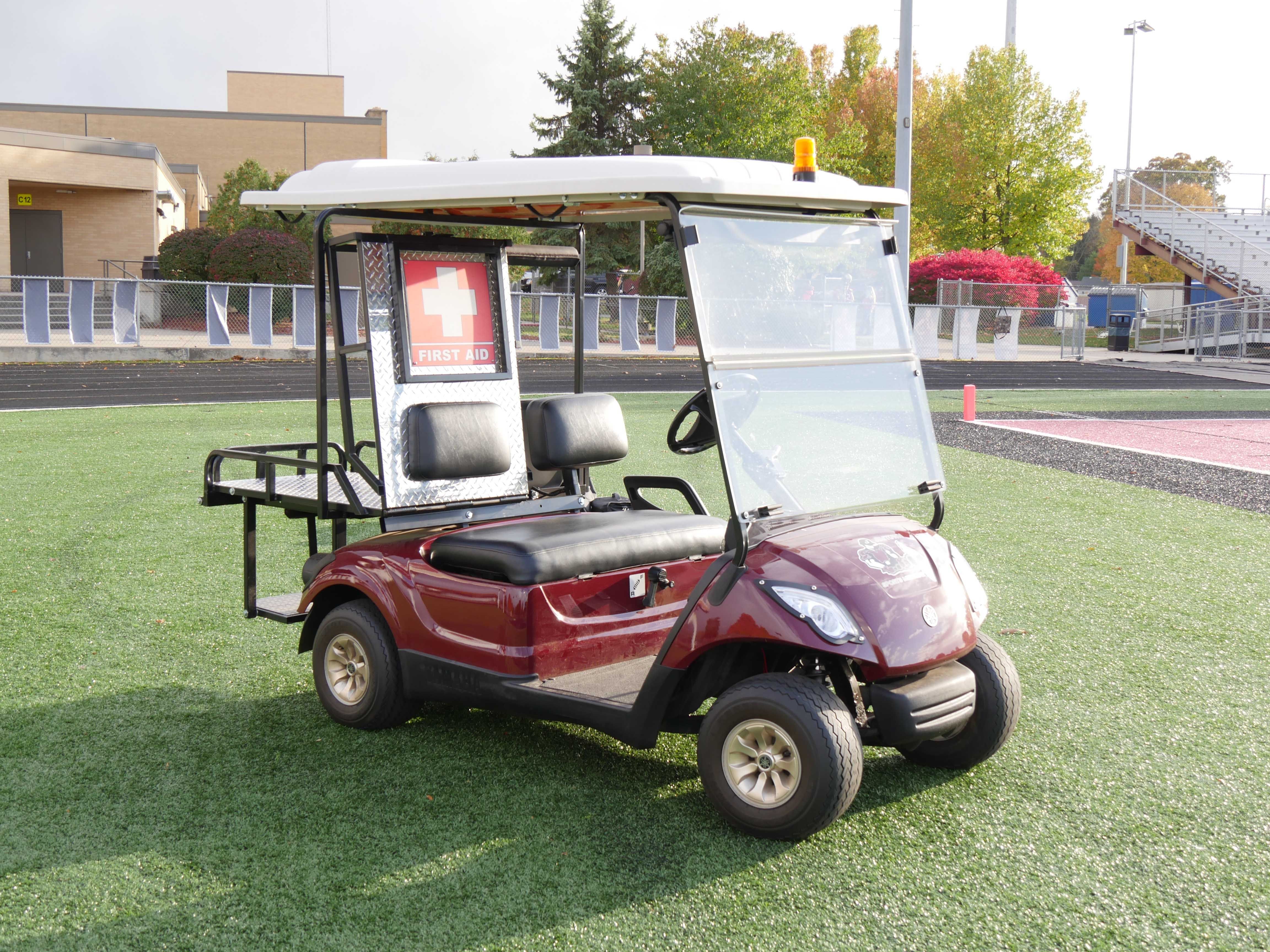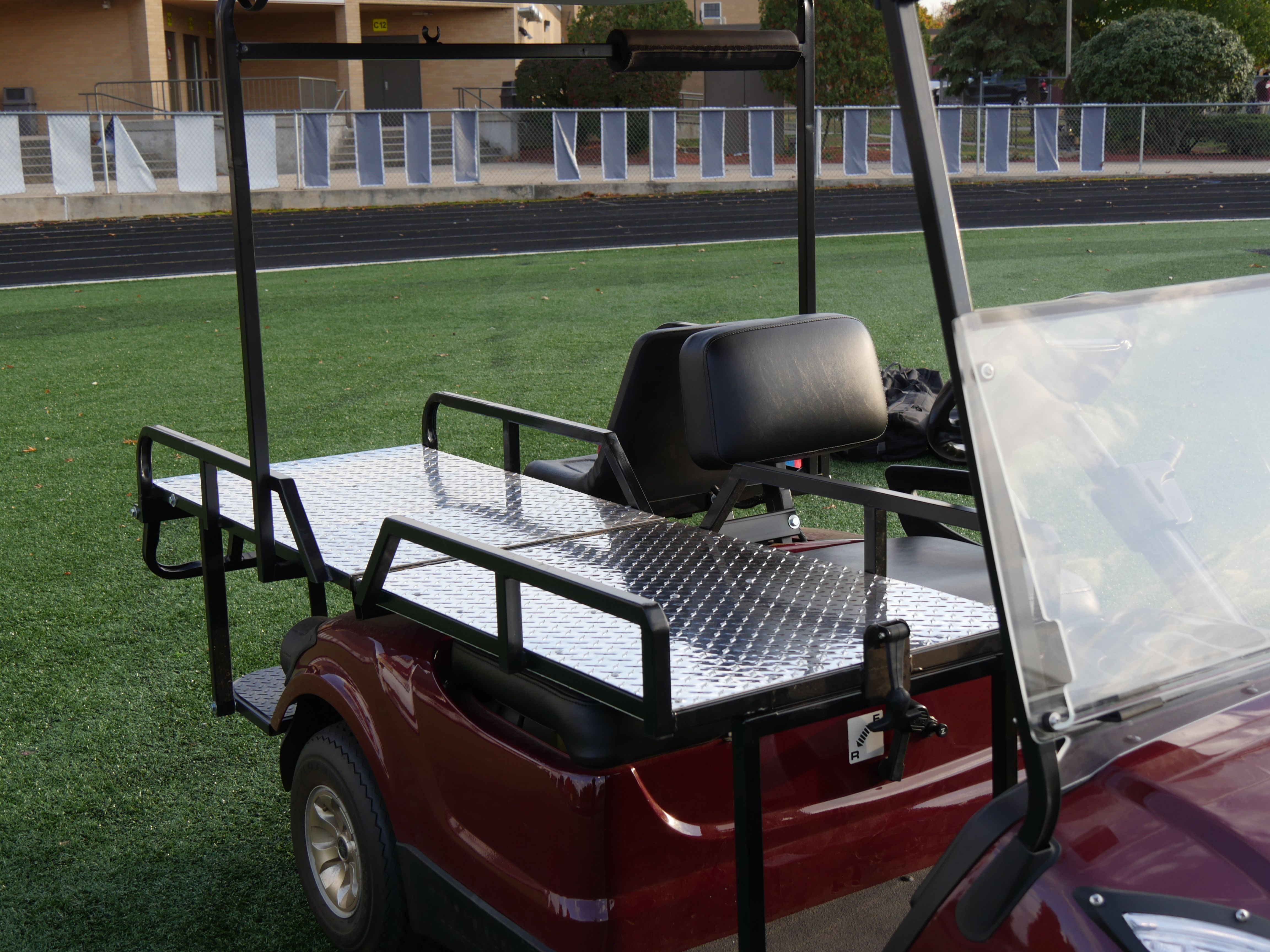 Located under the roof of the emergency cart is a back stretcher, crutches and additional medical supplies and straps. On the rear of the cart there is a platform to haul water and additional supplies while not using the medical cart for injuries or additional personnel. The cart has a full width rear view mirror to keep a safe eye on passengers while driving cautiously to medical attention destination. Extra padded seats have been installed for daily comfort and use.