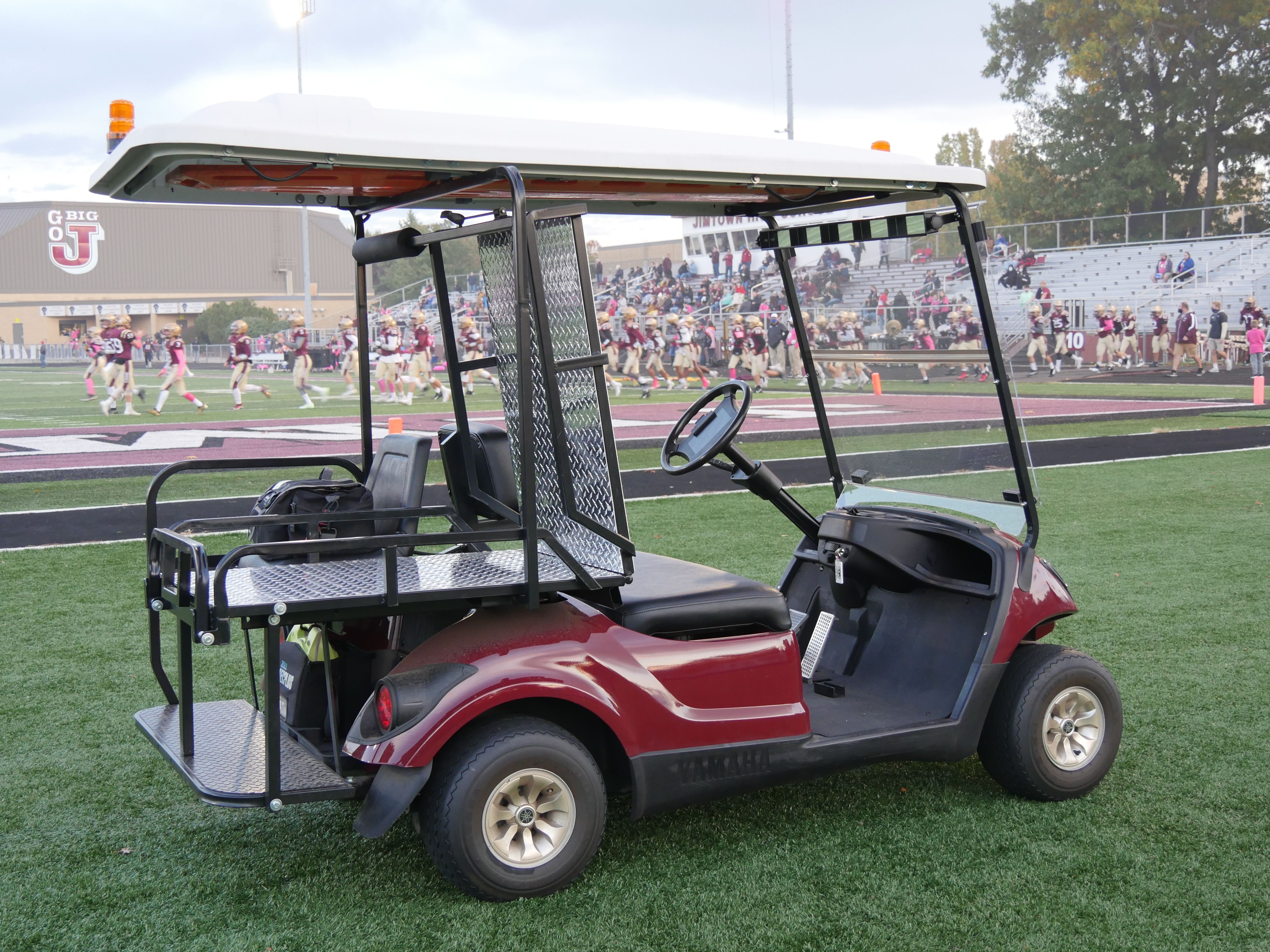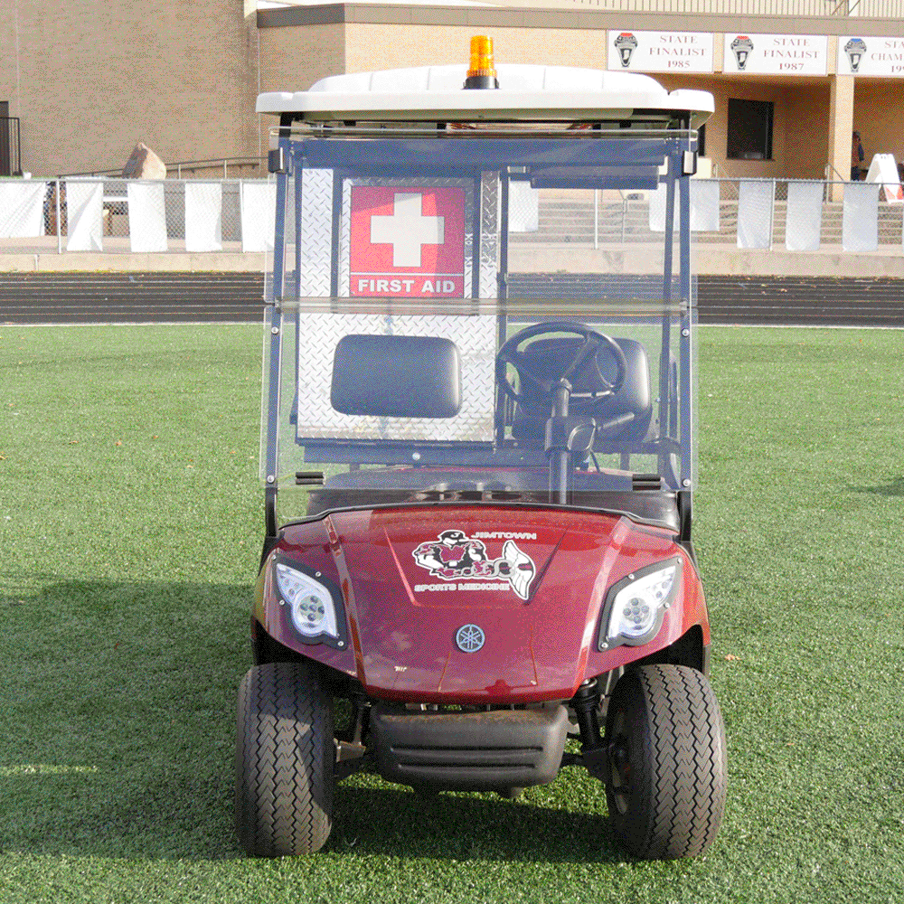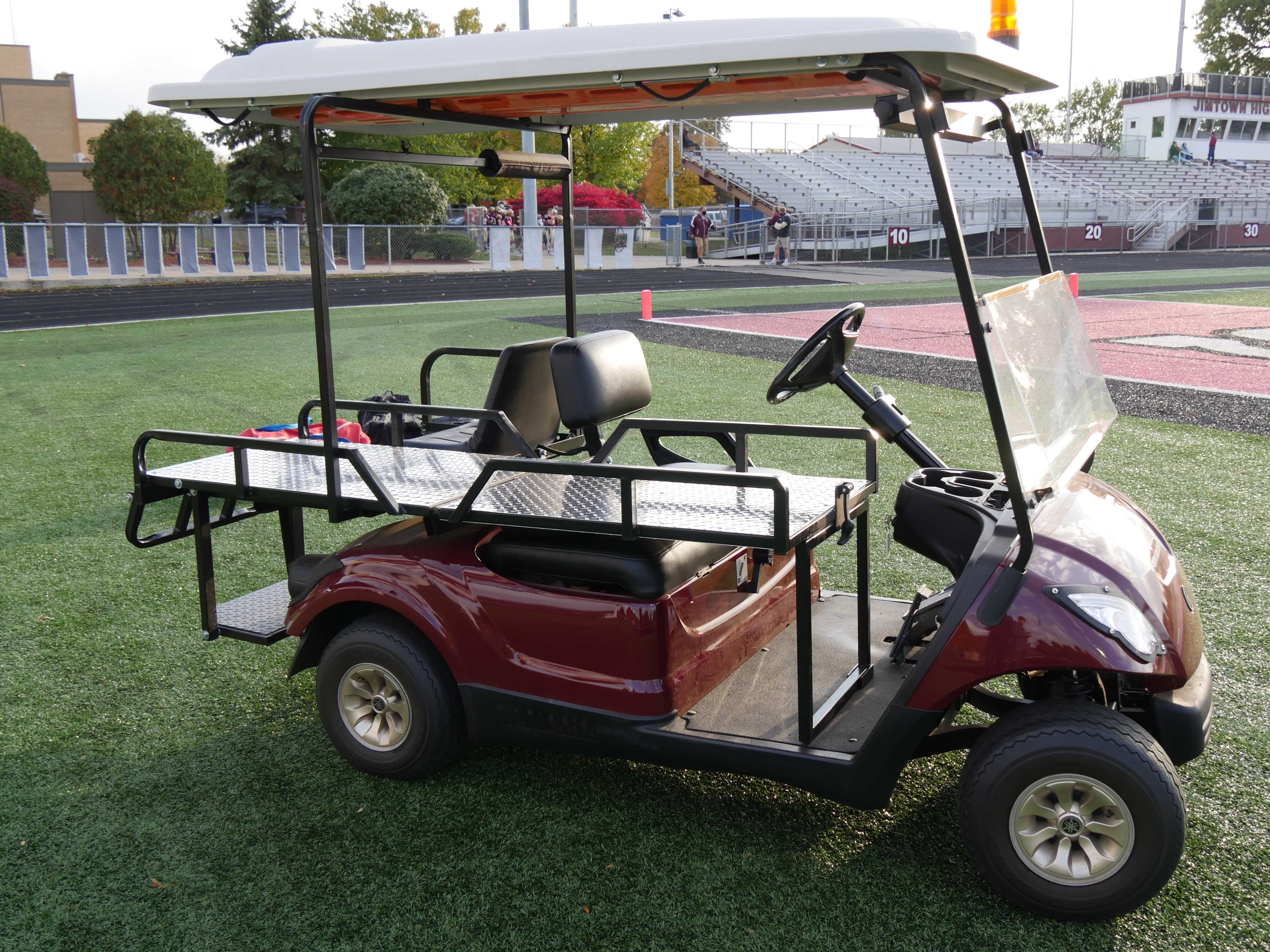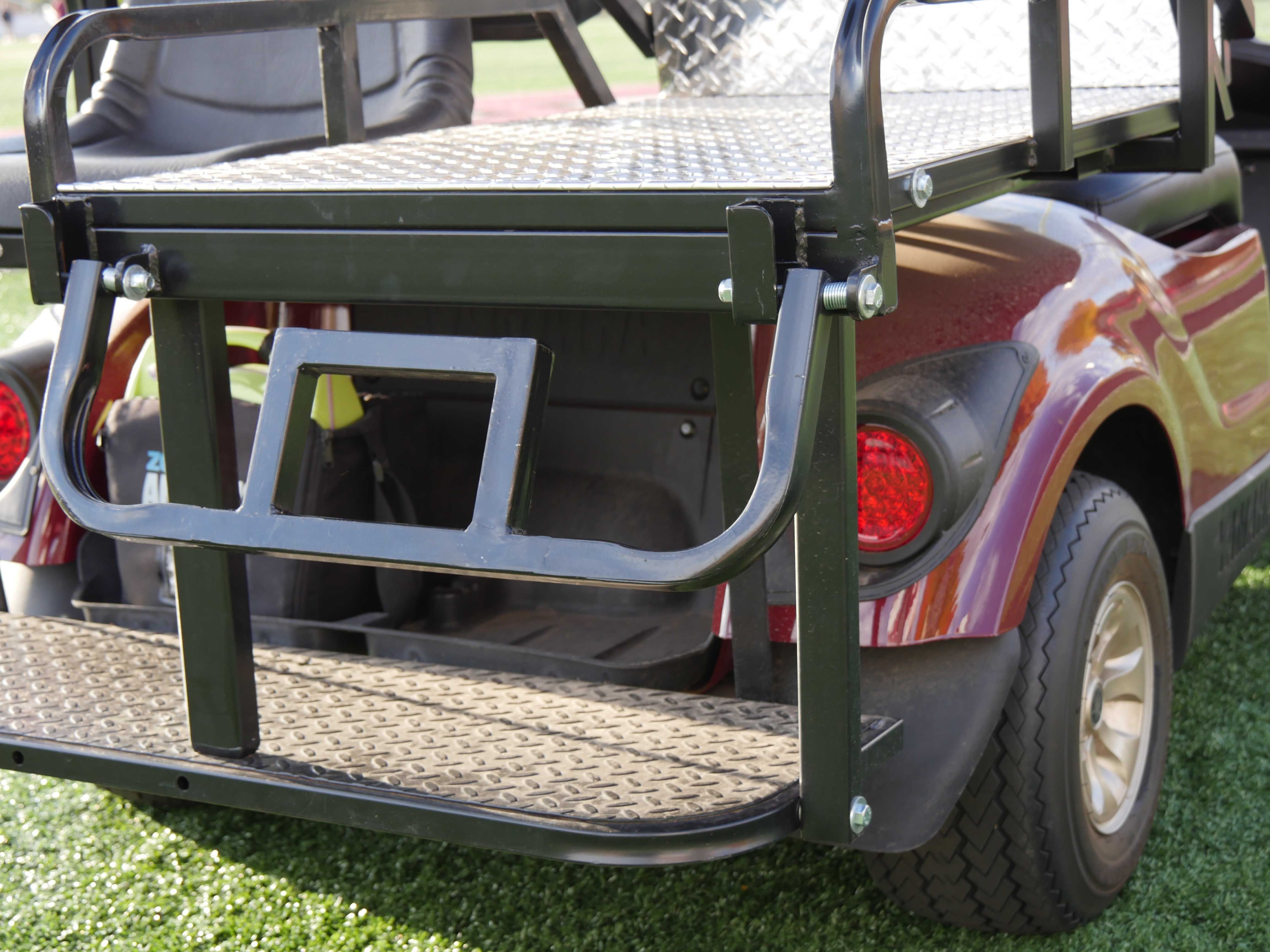 Located under the roof of the emergency cart is a back stretcher, crutches and additional medical supplies and straps. On the rear of the cart there is a platform to haul water and additional supplies while not using the medical cart for injuries or additional personnel. The cart has a full width rear view mirror to keep a safe eye on passengers while driving cautiously to medical attention destination. Extra padded seats have been installed for daily comfort and use.
